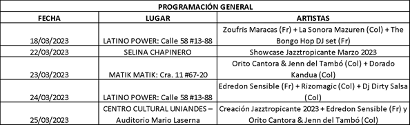 La 6ta versión del festival Jazztropicante tendrá este año 5 eventos con 6 agrupaciones y 2 Dj sets, en Bogotá, con algunas fechas más por confirmar en otras ciudades. La creación inédita que reúne a Edredón Sensible, un cuarteto de la ciudad de Toulouse (Suroeste de Francia) y Orito Cantora & Jenn Tambó, un dúo de Barranquilla, a las agrupaciones francesas Zoufris Maracas y The Bongo Hop Dj Set y las colombianas Sonora Mazuren, Rizomagic, DJ Dirty Salsa y Dorado Kandua.