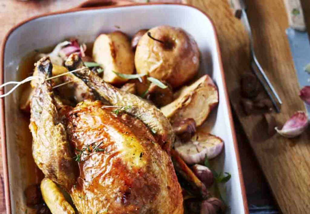 2. Pollo al horno con manzanas francesas y nueces